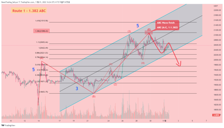 このビューでは、C波はもう1つの波を上昇して21.5k~21.6k、つまり1.618A波の値になり、平行チャネルブレークラインと重なると予想されます。