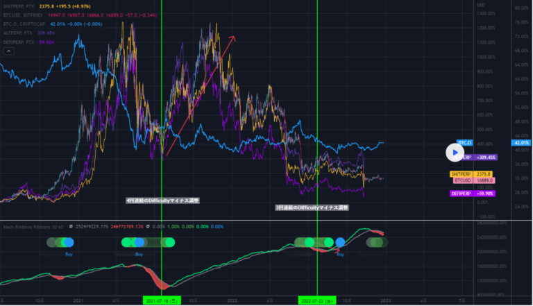 ビットコインの採掘ハッシュレートの数値を元にシグナルを出すハッシュリボンが日足ベースで再び弱気に転じた、平均線はデッドクロスの様相を見せマイナーが苦しい展開が続く
