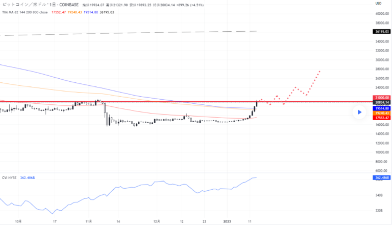 オプショントレードの影響より仮想通貨の盛り上がりの再開が強いため、21000を抜ければまずは週足で8月にもみ合った高値である25000までは行きそうです。