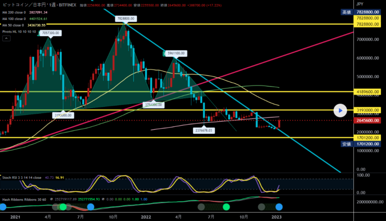 昨年の5月以降に週足でヘッドアンドショルダー完成から下に抜けると予測した通りになった。しかし、2021年のように凄まじい上昇はまったく見込めず厳しい展開は長引く。11月の大陰線からはさらに安値圏で停滞しジワジワと下落するかに見えたが、先週に急上昇となり、久しぶりの大陽線となった。