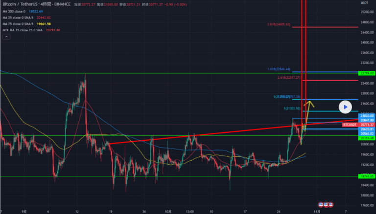 一つ前の分析通りに順調に伸びていってますが、一番の強敵である日足や4時間足レベルでの超重要トレンドラインに2回目の挑戦です。
