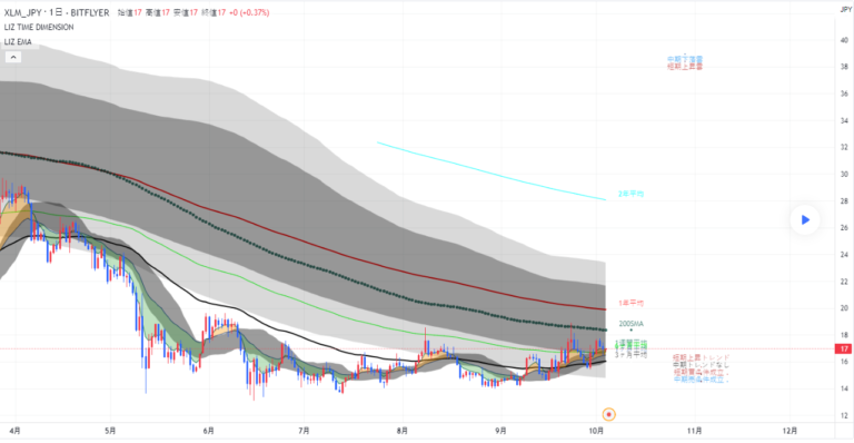 XLMはずっと下落の中、ずっと1年移動平均線(赤色)の下でした。