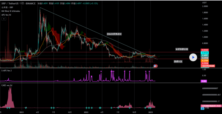 リップルは200日線を上抜け、一目均衡表の雲の上まで回復、2022年の11月初旬ごろまで価格を戻した。